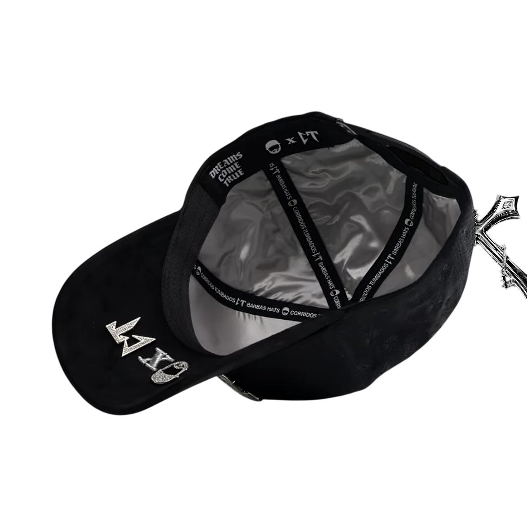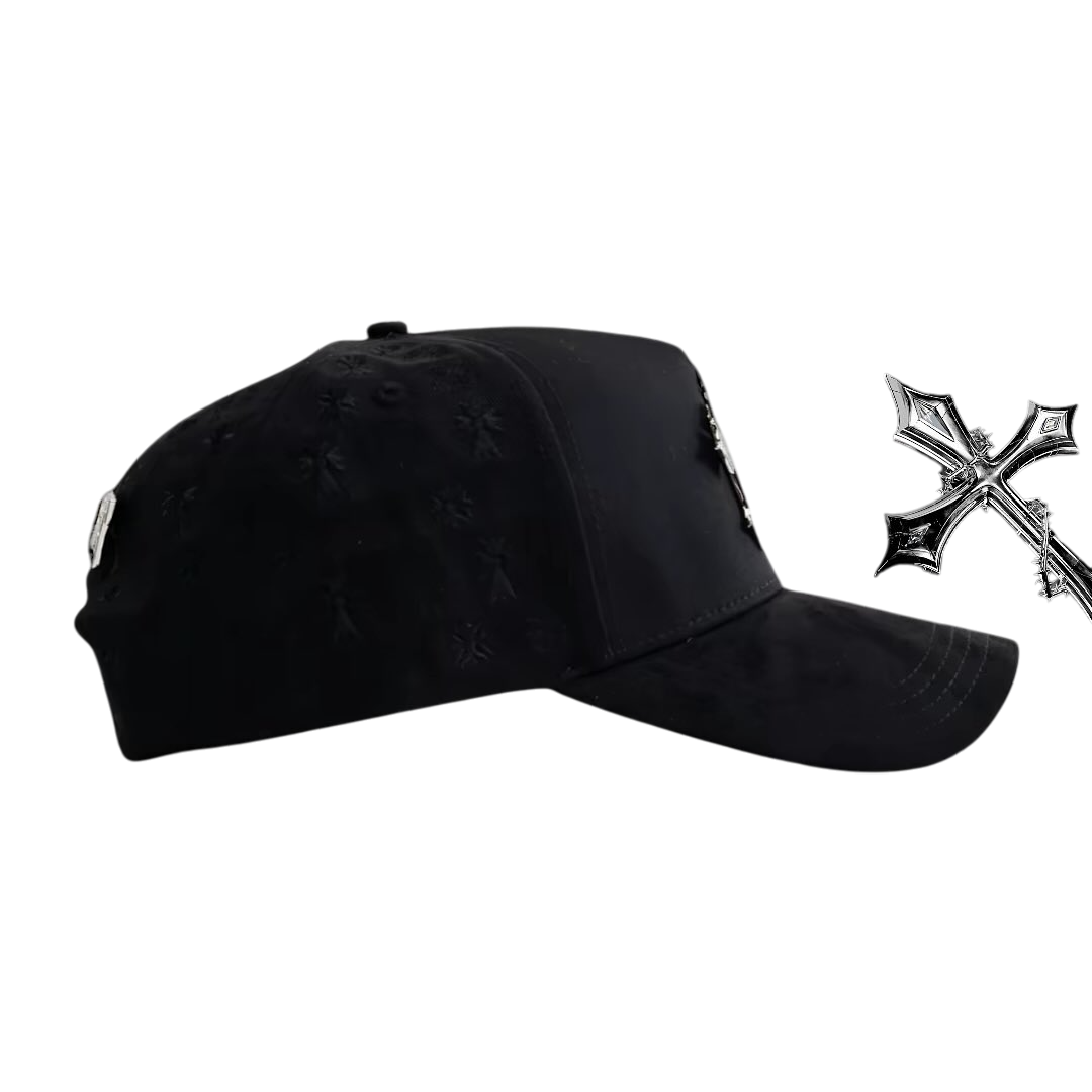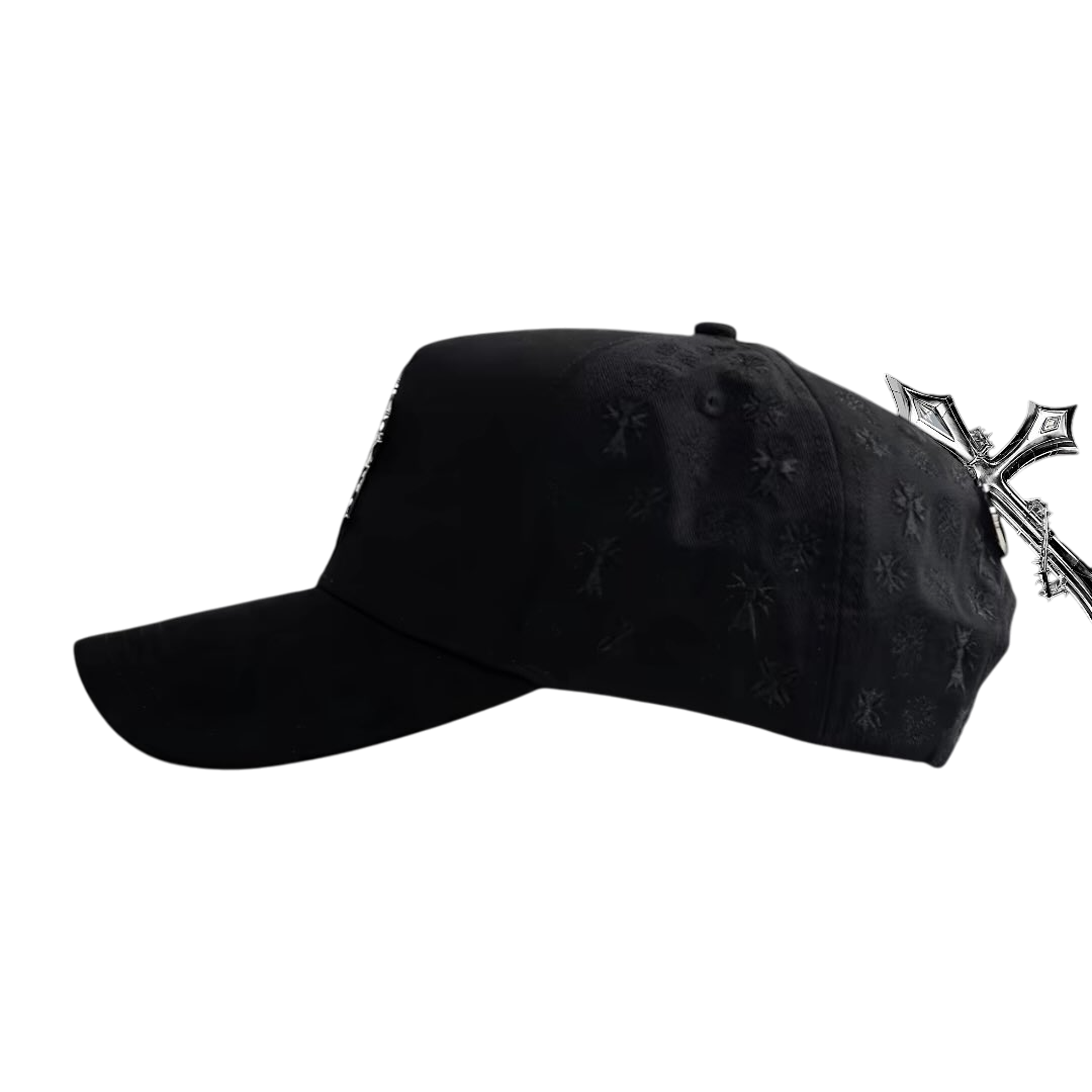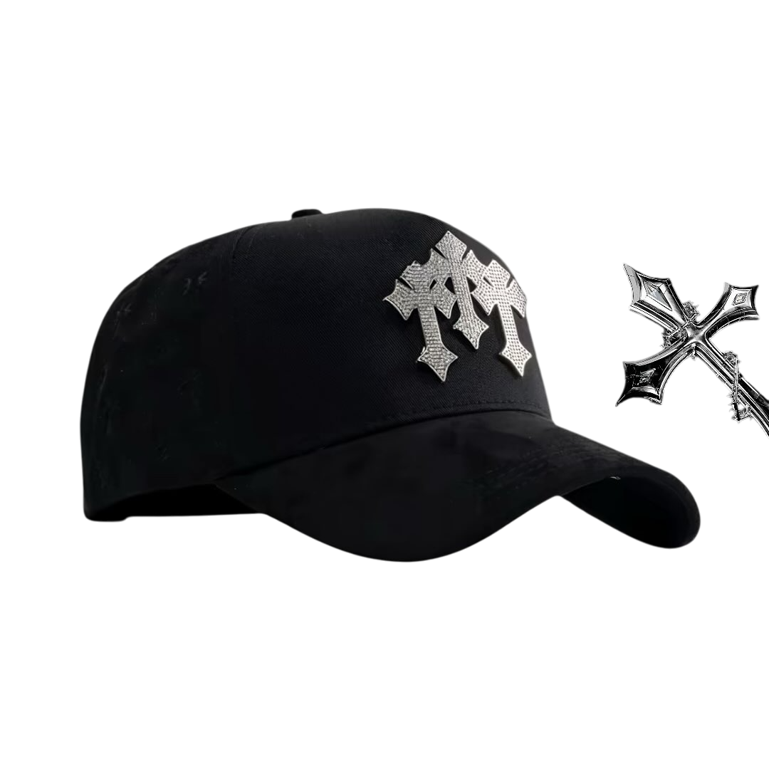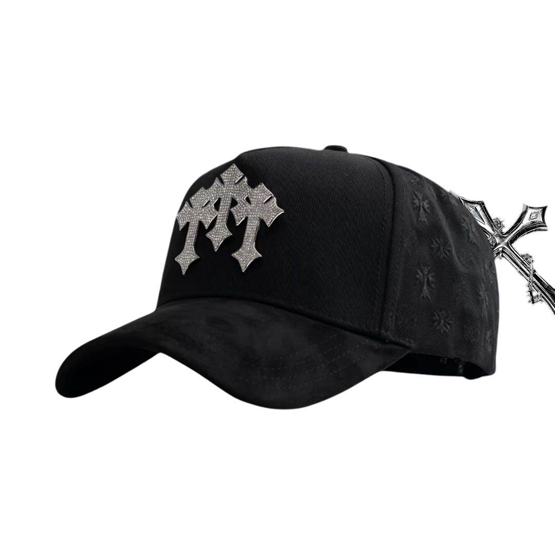 👍This hat is a statement piece that successfully merges streetwear sensibilities with gothic and luxury aesthetics. The combination of the bold, sparkling emblem, mixed materials, subtle tonal patterns, and premium interior finishing makes it a highly distinctive and impactful fashion accessory.